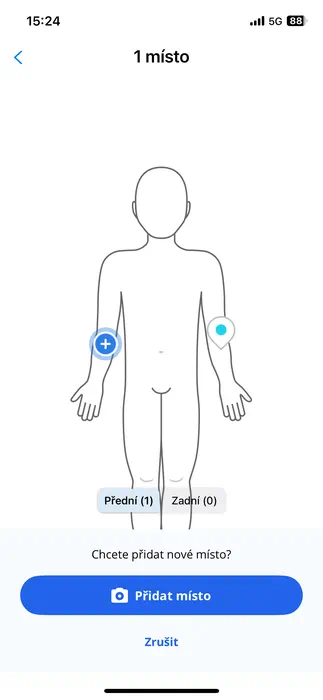 V aplikaci kliknete na ikonu fotoaparátu a na Mapě těla si vyberete místo, kde budete skenovat své