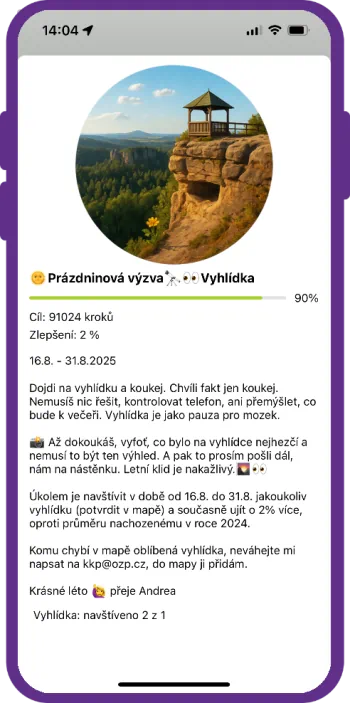 Přemýšleli jste někdy nad tím, proč Každý krok pomáhá? Nejen, že je chůze sama o sobě zdravý pohyb, zlepšuje kondici, čistí hlavu, snižuje stres… je i dostupná, nemusíte si na ni kupovat žádné speciální vybavení, snad jen pohodlné boty – a zároveň i šetrná k přírodě. Stačí pár kroků denně navíc a malá změna se brzy nasčítá ve velký efekt.NÁVOD NA POUŽÍVÁNÍ APLIKACE KAŽDÝ KROK POMÁHÁ